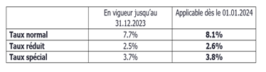 A partir du 1er janvier 2024, les taux de TVA vont être augmentés, à savoir :